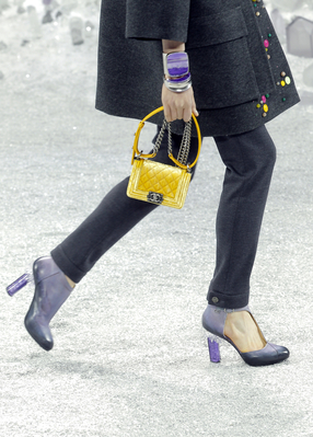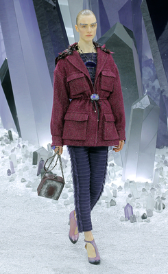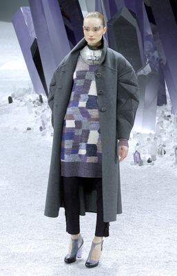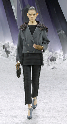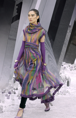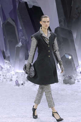 Один из главных трендов от Карла Лагерфельда – это многослойность. В следующем холодном сезоне дизайнер предлагает носить одновременно брюки, платье и пальто, и дополнять образ крупными металлическими аксессуарами.