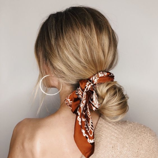 Отличный вариант для обладательниц недостаточно вьющихся, но все же не прямых волос. Низкий хвост на затылке, не до конца вытащенная через него прядь-петля и несколько свободных прядей у лица: небрежность в моде!