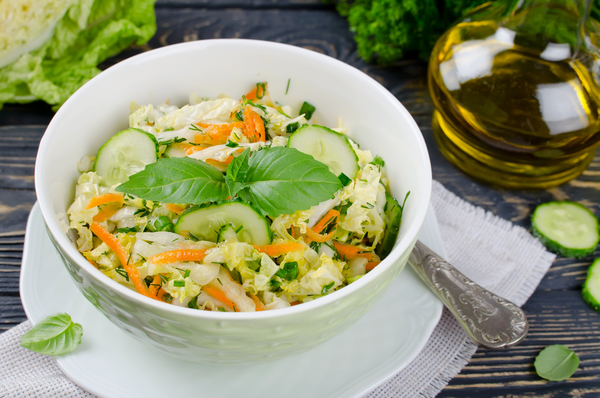 Легкий постный салат готовится из пекинской капусты, свежих огурцов, моркови и зелени. Такой салат можно заправить подсолнечным, кукурузным или оливковым маслом.
