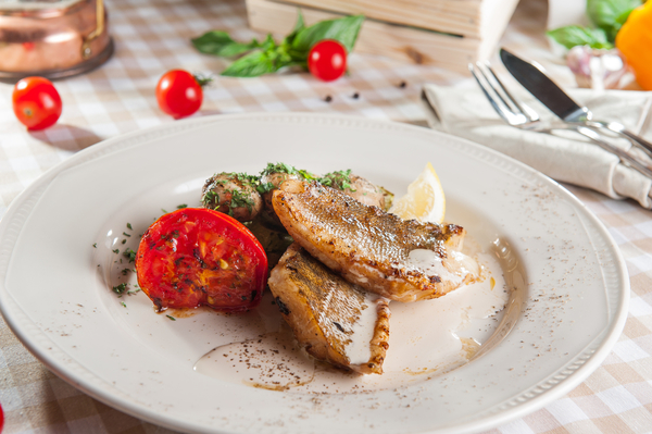 5. Судак подавать вместе с отварным картофелем и подливой, посыпав рубленой зеленью петрушки.