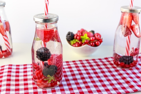 Рецепт детокс-напитка с клубникой, малиной, смородиной, ежевикой и мятой. Он должен постоять несколько часов в холодильнике, чтобы вода приобрела ягодный вкус.