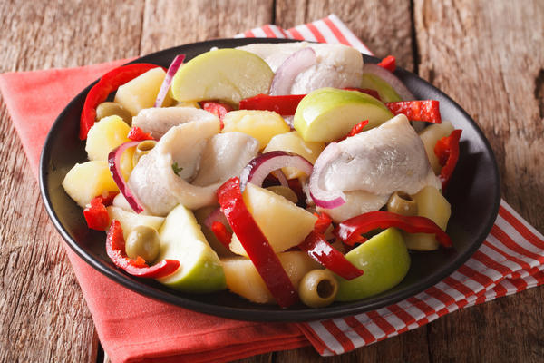 Рецепт салата из филе сельди, картофеля, яблок, сладкого перца, лука и оливок с горчичной заправкой.