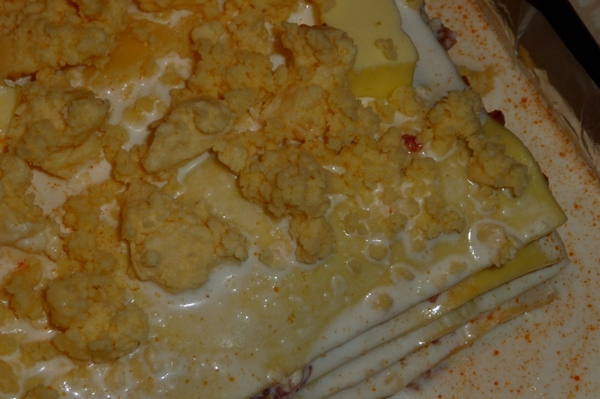 6. Отваренные пласты лазаньи вынуть из воды. Плоскую четырехугольную форму для запекания смазать жиром. Треть пластов теста положить на дно формы, на них положить половину фарш и немного соуса, накрыть еще третью пластов теста, положить остальной фарш и немного соуса, накрыть оставшимися пластами теста, равномерно распределить соус так, чтобы тесто было полностью покрыто.
