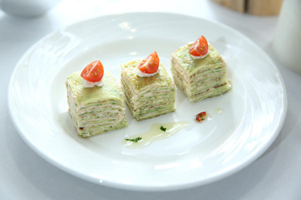 Канапе из шпинатных блинов с муссом из норвежской семги