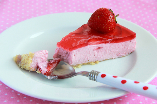 Ставим форму в холодильник до полного застывания мусса (или в морозильную камеру на 15 минут). Тем временем нарежь оставшуюся клубнику. Когда мусс застынет, выкладываем на него клубнику Выкладываем клубнику и аккуратно заливаем клубничным желе. Отправляем торт в холодильник на 3 – 4 часа.