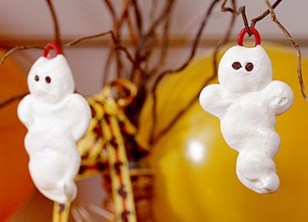 Безе-привидения можно использовать для создания композиций на Хэллоуин. например, прикрепить на тонкие сухие ветки.