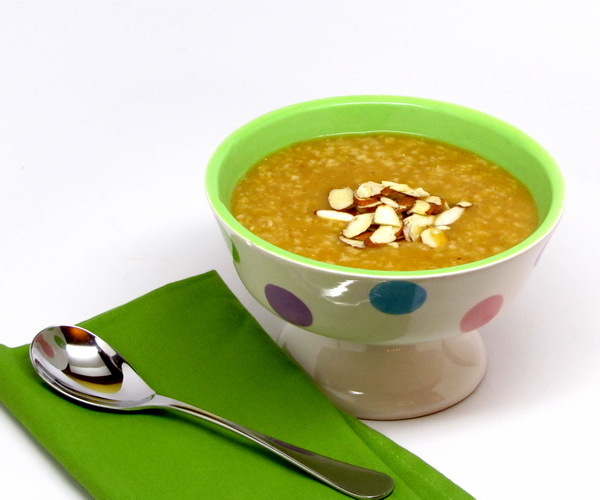 Поджарить миндаль в духовке или на сухой сковороде, остудить и измельчить. Довести воду до кипения, добавить соль и овсяные хлопья быстрого приготовления. Готовить на среднем огне, помешивая, около 2 минут.