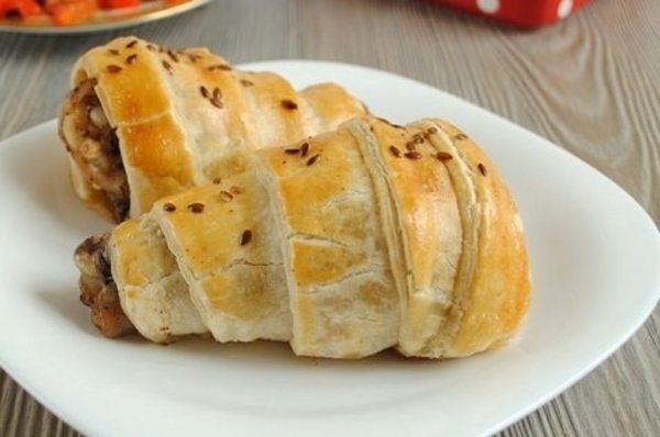 Размороженное слоеное тесто порезать длинными полосками и обернуть остывшую курицу. Переложить подготовленные ножки на противень, смазать слегка взбитым яйцом и запекать 40-45 минут. Когда тесто подрумянится, прикрыть его фольгой. Подавать готовое блюдо горячим.