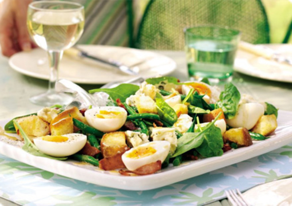 Пока готовится бекон, отварить яйца в течение 8 минут, остудить и очистить. Бланшировать зеленую фасоль: готовить ее в подсоленной кипящей воде 5 минут, затем слить жидкость и окатить фасоль ледяной водой.