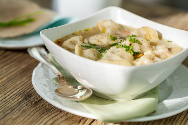 В кипящий бульон добавить пельмени (примерно 10-15 шт. на 1 порцию), и варить до готовности пельменей. Готовое блюдо посыпать сушеной мятой и любой зеленью. Отдельно можно подать очень мелко нарезанный чеснок, заправленный уксусом.