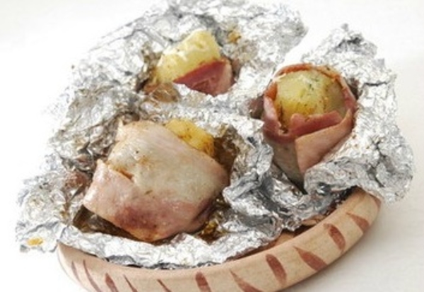 Заворачиваем картофель в бекон, а затем заворачиваем картофель с беконом в фольгу. Выкладываем картофель на противень и помещаем его в духовку. Запекаем картофель при температуре 170 С 10-15 минут.