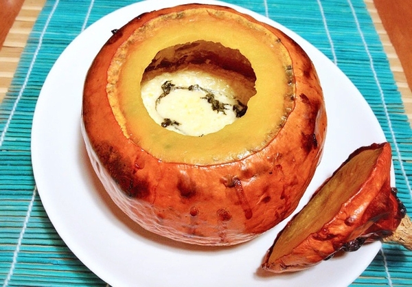 Подаем тыкву горячей в суповых тарелках, вычерпываем мякоть вместе со сливочным соусом. Приятного аппетита!