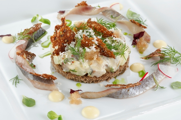 Отварной картофель мнем вилкой, добавляем горчичный соус, перемешиваем. Выкладываем пюре на тосты, вокруг основания раскладываем нарезанного сельди вместе с разрезанными пополам перепелиными яйцами, сверху приправляем тертым хреном, майонезом с тархуна и посыпаем укропом.