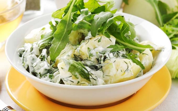 Отличный летний салат из молодого картофеля с зеленью, чесноком и сметаной.