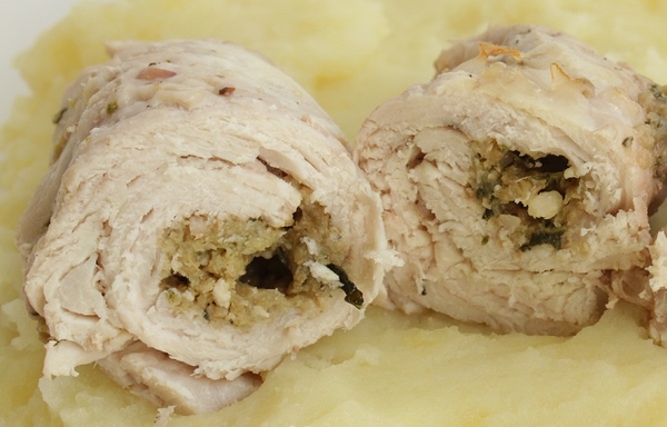 4. Выкладывать по 1-2 ч.л. сырно-базиликовой массы на каждую отбивную и сворачивать мясо плотными рулетиками. Сбрызнуть оливковым маслом.