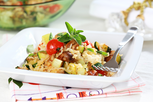 4. Промыть рис, обжарить его с овощами в течение 3 минут. Добавить 200 мл горячего бульона и выпарить, постоянно перемешивая. Добавлять по 200 мл бульона, каждый раз полностью выпаривая. С последней порцией бульона добавить специи: базилик, тимьян, розмарин. Посолить по вкусу. Готовый рис должен внутри остаться слегка плотным, с твердым ядрышком внутри, но не сырым. Эта стадия готовности называется аль денте.