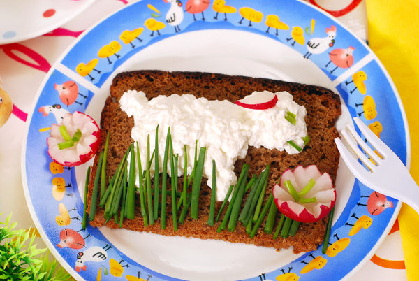 1. На ломте черного хлеба выложить зернистый творог в виде овечки.