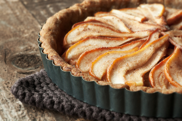 5. Миндальную массу переложить в тартинку. Сверху внахлест разложить кусочки груш.