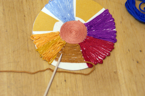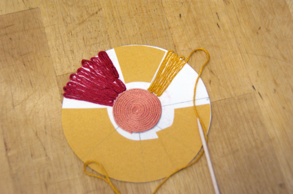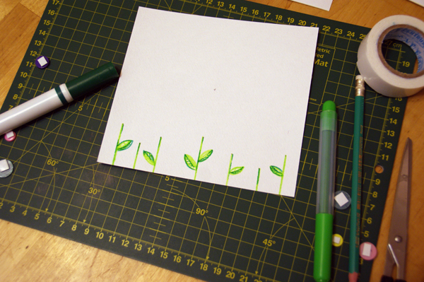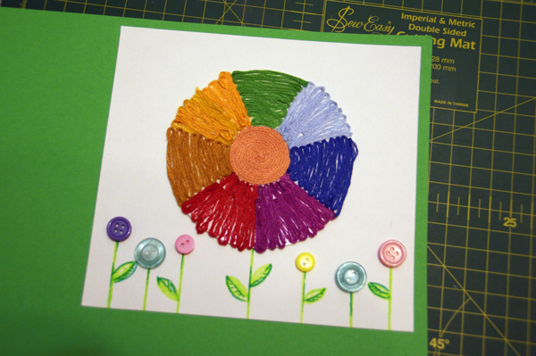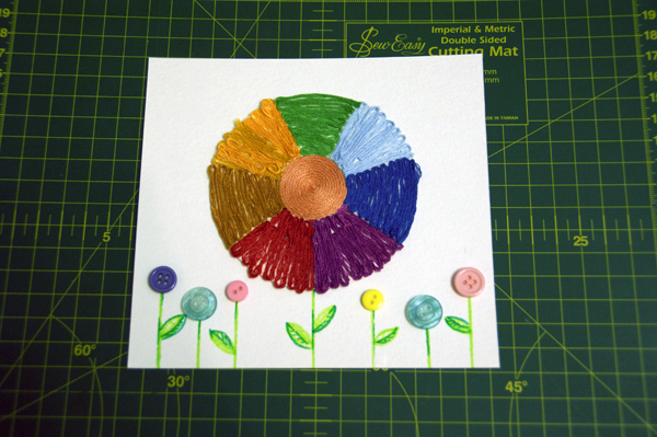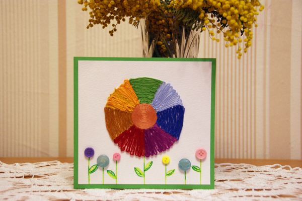 нитки мулине, акварельная бумага, цветная бумага, двухсторонний скотч (тонкий и вспененный), пуговицы, зеленый фломастер.