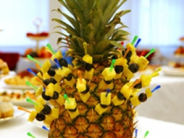 4. На тарелку кладем целый ананас. Вокруг выкладываем кусочки лимонов, а в сам ананас втыкаем канапешки.