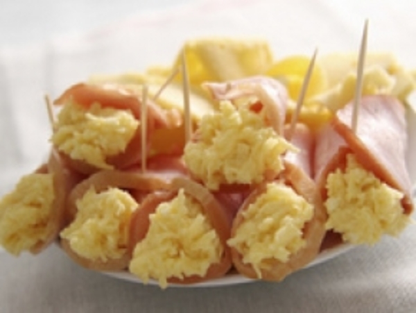 5. Раскладываем на рабочей поверхности ветчину. Посередине выкладываем омлет и заворачиваем. Чтобы рулетики не распадались, скрепливаем шпажками.