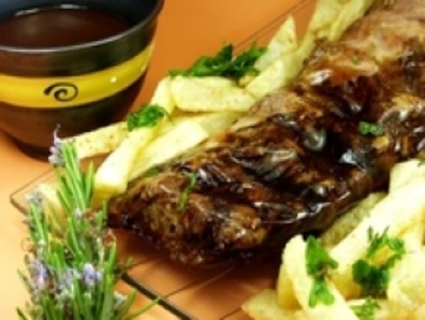 9. Нарезанные дольками яблоки и порезанный соломкой картофель выкладываем в фольгу, свёрнутую "лодочкой", поливаем собранным соком и кладем рядом с мясом на решетку.