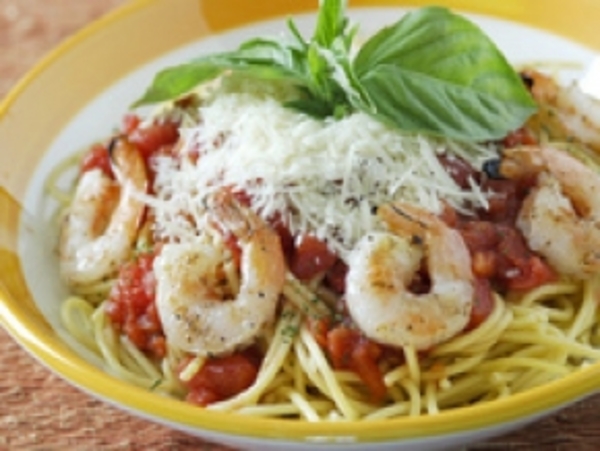4. Разложи спагетти по тарелкам, полей горячим соусом, сверху выложи креветки. Посыпь тертым пармезаном. Укрась веточками базилика.