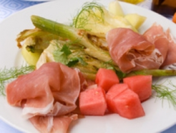 6. Ветчину тоненько нарезаем, заворачиваем в рулетик и выкладываем с обеих сторон от картофеля с луком.