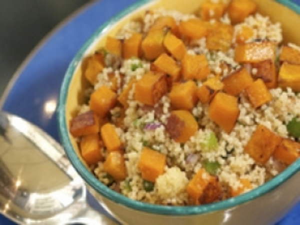 2. Тыкву чистим, выбираем семена, нарезаем кубиками и выкладываем к луку и перцу.
