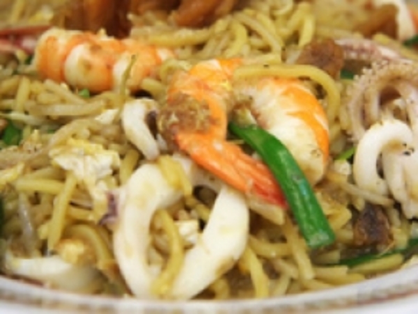 2. В хорошо разогретую сковородку с оливковым маслом кладем нарезанный кубиками репчатый лук, обжариваем 2-3 мин. Потом добавляем лапшу и морепродукты, курагу и слегка обжариваем еще 3-4 мин.