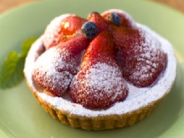 3. Из кексов выбираем немного мякиша, раскладываем крем, украшаем половинками клубник и посыпаем все сахарной пудрой.