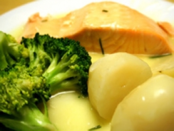 7. В жаростойкую посуду кладем рыбку, разобранную на соцветия брокколи и картофель.