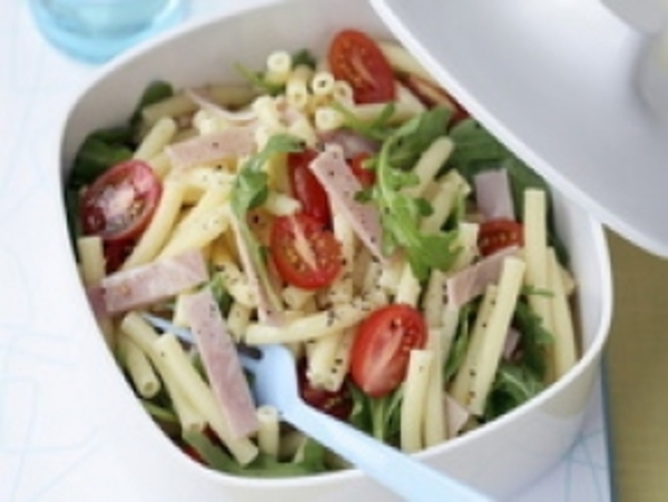 6. Кладем обратно в кастрюлю, добавляем ветчину, рукколу и черри. При необходимости досаливаем, перчим и заправляем все 3-4 ложками масла.