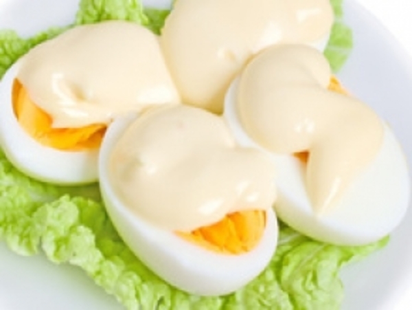 3. На тарелку выкладываем листья салата, сверху на него кладем яйца, политые майонезом.