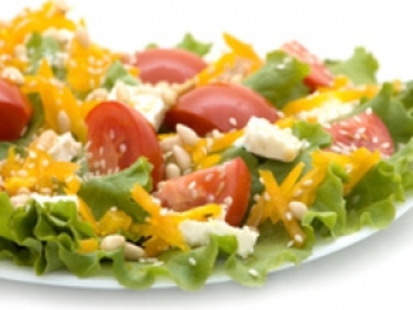 4. В миске соединяю помидоры, перец, сыр, кунжут и орешки, солю и перчу по вкусу, заправляю маслом и перемешиваю.