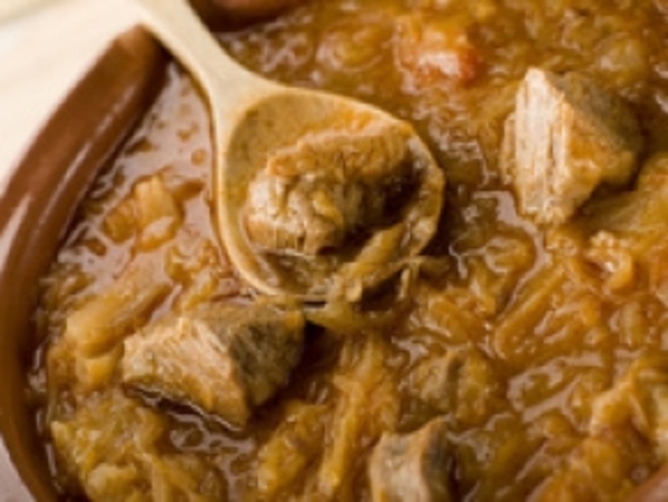 9. Вливаю бульон с томатом, выкладываю овощи и довожу до кипения. Добавляю ложку соевого соуса. Когда начнет загустевать, снимаю с огня, выкладываю в керамическую посуду и подаю на стол.