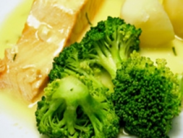 5. Картофель отвариваем, сливаем, заправляем ложкой масла. Брокколи бланшируем в подсоленном кипятке 5-7 минут, вынимаем и поливаем ложкой растопленного масла, отставляем.