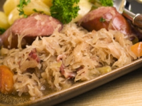 4. Слегка обжариваем бекон и колбаски 2-3 мин. Добавляем к капусте вместе с жиром за 5 мин. до конца тушения. Солим, перчим, посыпаем эстрагоном.