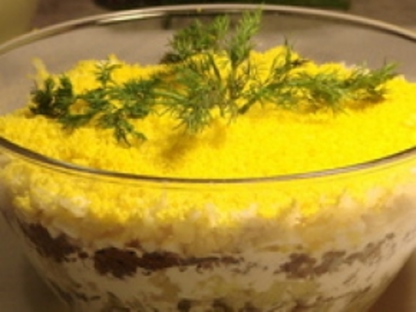 7. Верхний слой салата – грибы. Верх "шубы" смазываю майонезом. При желании можно украсить эту закуску натертым вареным желтком или несколькими веточками свежей зелени.