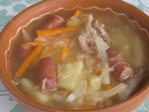4. Вынимаю мясо, шпик и сосиску. Нарезаю кусочками и кладу в суп. Подаю горячим.