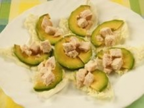 7. Авокадо разрезаю на две половины, удаляю косточку, снимаю кожуру и нарезаю тоненькими пластинками. Сбрызгиваю лимонным соком, чтобы сохранить цвет мякоти. На листья подготовленной пекинской капусты выкладываю ломтики авокадо.