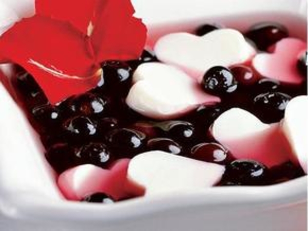 Сочетание двух видов желе — миндального и черничного — создает неповторимый вкус. К тому же, белые миндальные сердечки выглядят очень романтично!