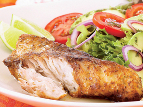 8. Рыбу подаем горячей с салатом и четвертушками лайма.