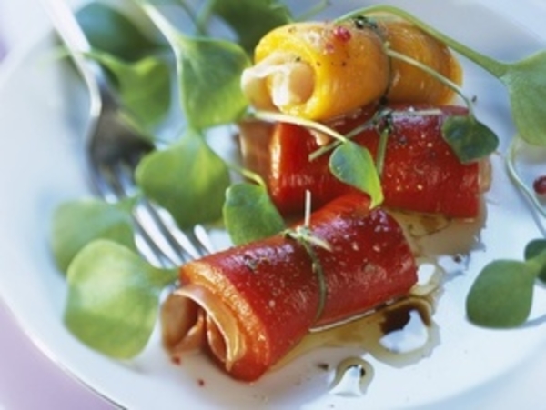 6. На каждую пластинку мяса выкладываем ветчину, сыр и перец, сворачиваем рулеты и фиксируем стеблями зелени.