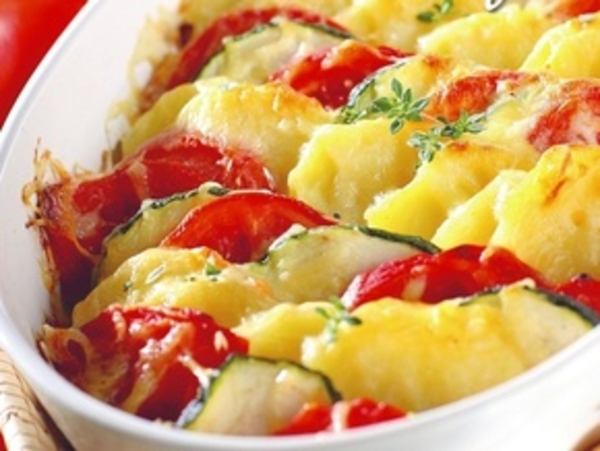 3. Сотейник или форму для запекания (лучше выбери не металлическую, а керамическую или из огнеупорного стекла) с помощью щеточки смазываем рафинированным маслом или растопленным маслом. По очереди рядами (ряд картофеля, ряд – помидоров и цукини) выкладываем туда овощи так, чтобы кружочки накладывались друг на друга.