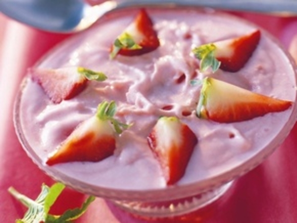 5. Переводим в креманки, украшаем разрезанной пополам клубникой и ставим в холодильник.