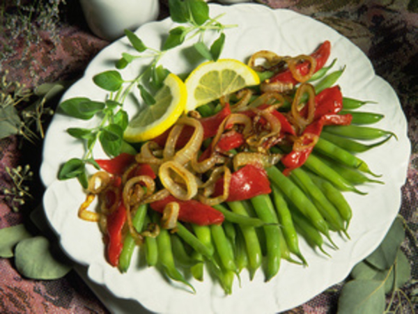 6. Фасоль отцеживаем, перекладываем на блюдо, сверху выкладываем лук с перцем.