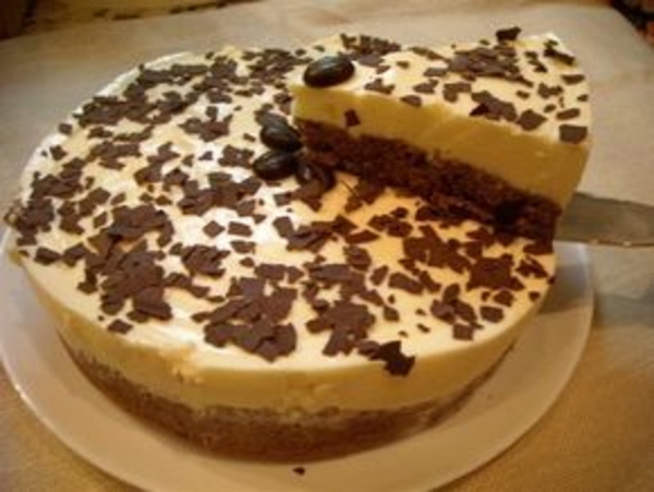 7. Ставим торт в холодильник приблизительно на 2 часа до застывания. Когда суфле застынет, вынимаем торт из формы и покрываем шоколадной глазурью.
