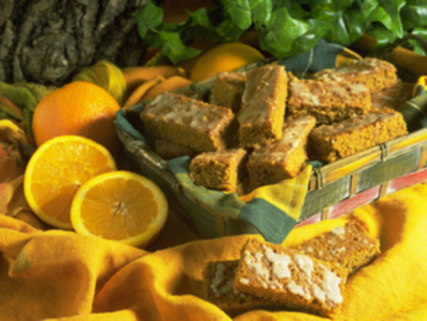 3. Когда остынет, посыпаем сахарной пудрой или смазываем глазурью (1 ст. л. апельсинового сока и 0,5стак. сахарной пудры), можно украсить цукатами из апельсиновых корочек.