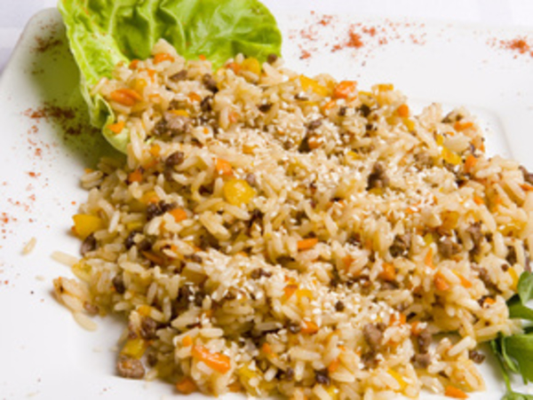 5. За несколько минут до готовности на рис сверху кладем мясо, посыпаем поджаренными кунжутными семечками или зеленью петрушки и укропа.